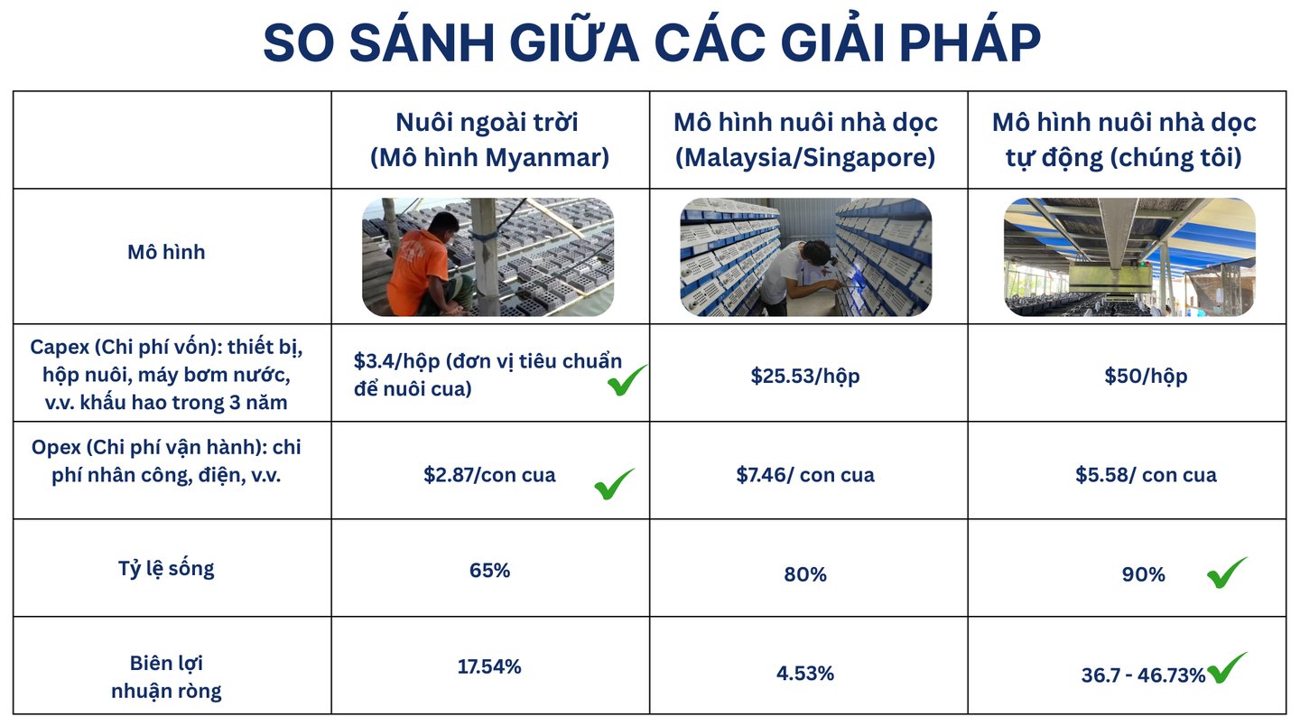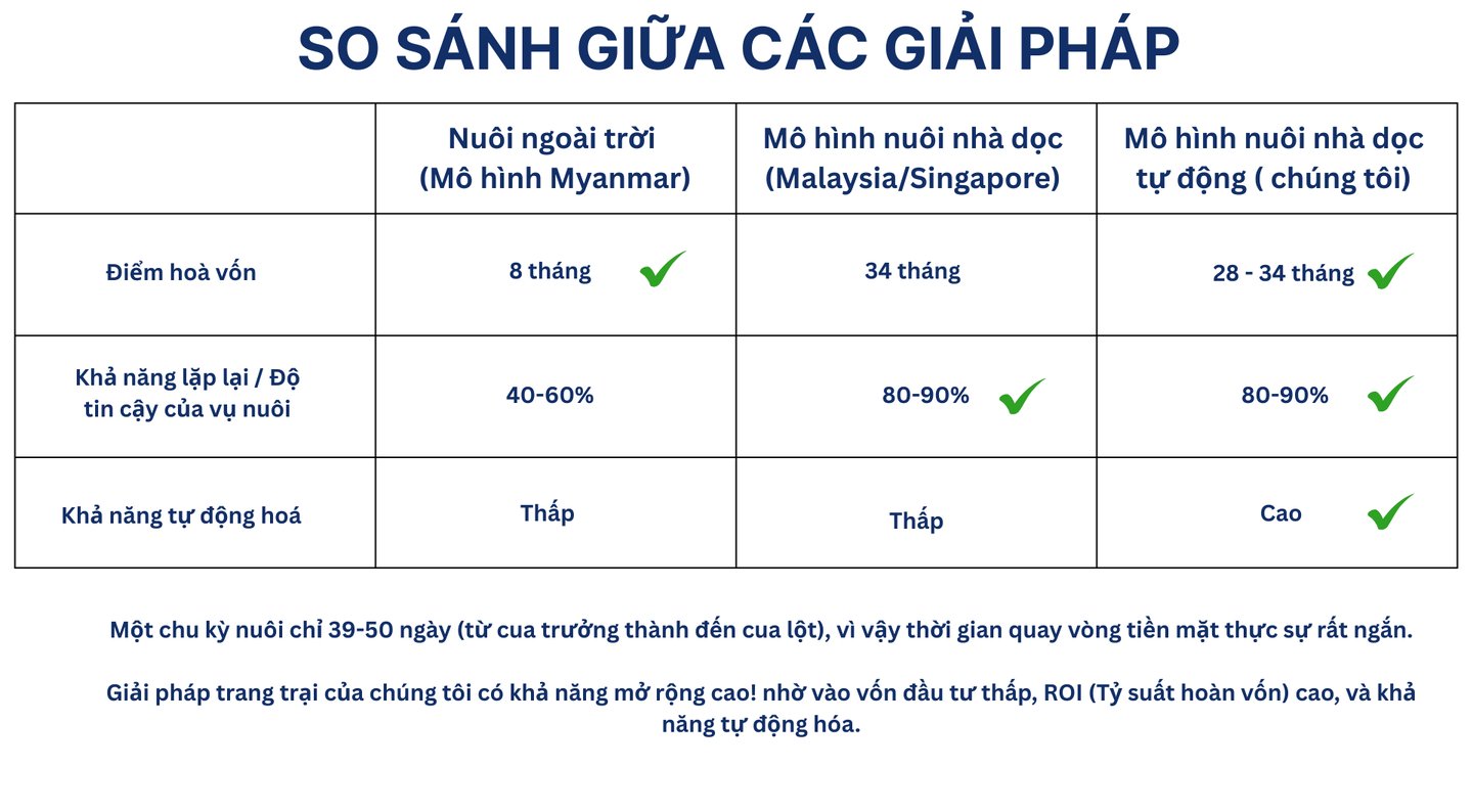 Ba mô hình nuôi cua phản ánh rõ ba giai đoạn phát triển của ngành: từ phụ thuộc tự nhiên → bán công nghệ → tự động hóa toàn diện. Trong bối cảnh chi phí lao động tăng, yêu cầu truy xuất nguồn gốc và chuẩn xuất khẩu ngày càng khắt khe, mô hình nuôi cua tuần hoàn tự động của Seamorny không chỉ là cải tiến kỹ thuật, mà là một hướng đi chiến lược dài hạn cho ngành cua Việt Nam.